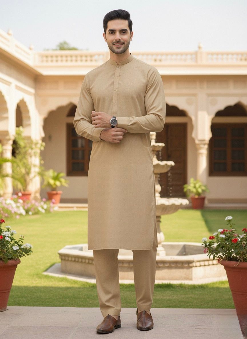 This elegant men’s shalwar kameez is crafted from premium quality fabric, designed for comfort and style. The...