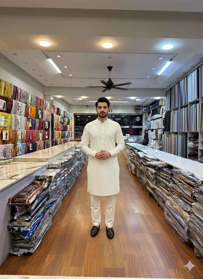 The image shows a well-dressed male model standing confidently in a fabric store, wearing a crisp white...