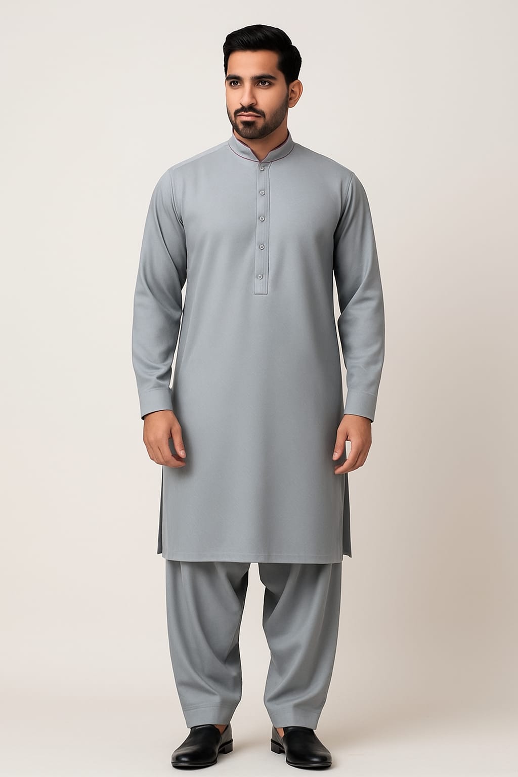 The image features a Pakistani male model wearing a well-tailored shalwar kameez made from a soft, light...