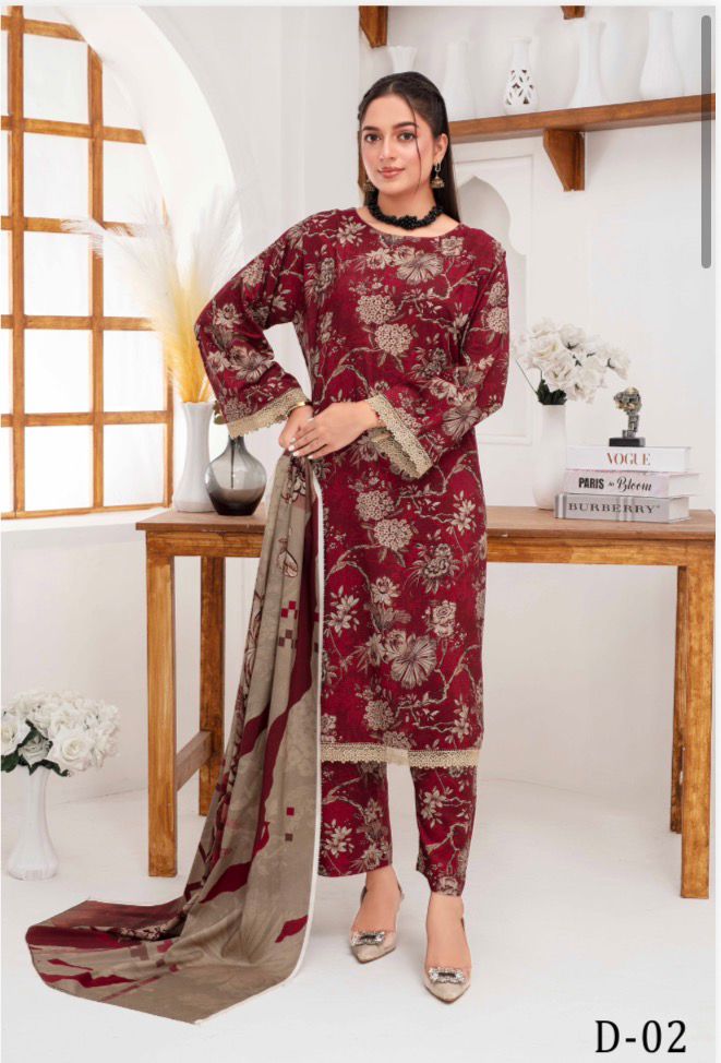 A striking maroon three-piece suit beautifully adorned with intricate beige floral prints. The shirt features a straight...