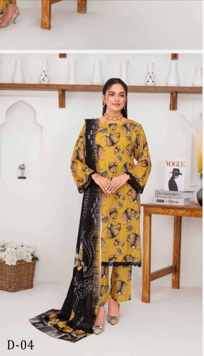 An elegant mustard yellow three-piece suit adorned with bold beige floral prints, giving it a timeless and...