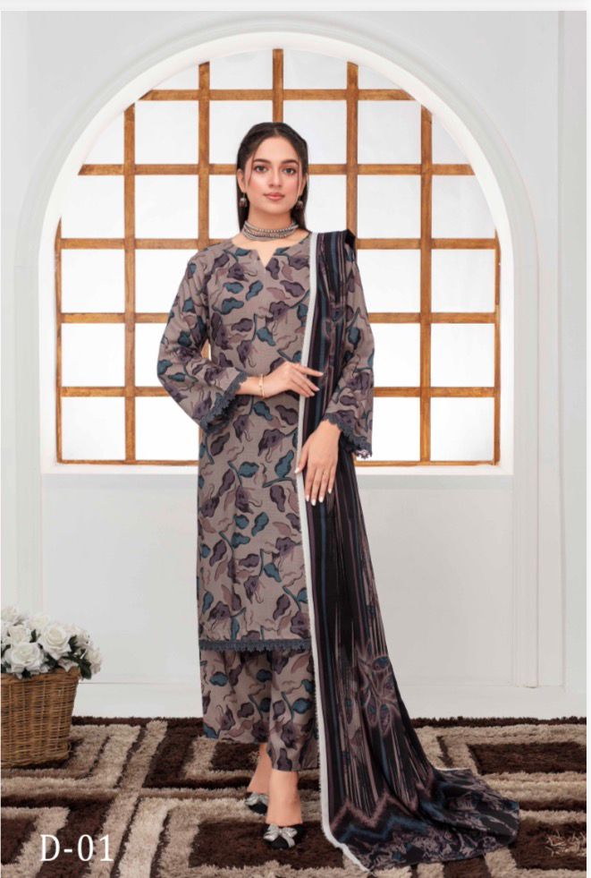 A beautifully designed three-piece suit featuring a soft grey base adorned with abstract floral prints in shades...